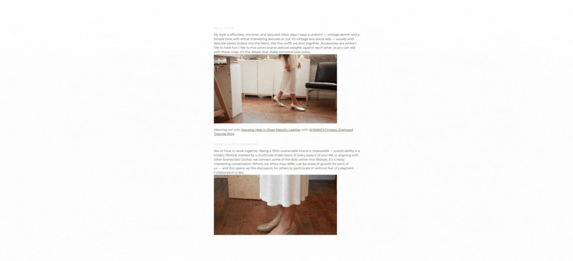 2017-2019Coclico is a conscious footwear brand. Rachel worked with the team on creating content for their journal. She ideated, art directed, styled, and wrote each story. She also produced each story’s correlating visual assets (photography and video) and edited the video content. Additional samples are available upon request.